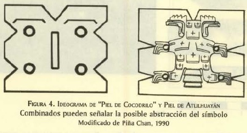 El signo esgrafiado en el fondo de la Canoa 2 lo identifico tentativamente como "Piel de Cocodrilo", metáfora del concepto de "plano terrestre" o "lugar de la creación", indicando la posibilidad de un sitio sagrado. Es difícil, sin conocer el lenguaje de los creadores del ideograma, dar el significado preciso, pero creo que es posible aproximarse al concepto general que se intentaba expresar. De todos es conocido que en el mundo mesoamericano había una concepción cosmogónica que dividía al "mundo" en planos terrestres y celestes, dentro de un orden cuatripartita.11 Por ello, es relevante señalar que los cuatro puntos del ideograma en cuestión podrían indicar rumbos cardinales o "esquinas del mundo", y la barra representar un quinto elemento o "centro".12 Hay que mencionar también la hendidura en "v" de la parte superior, la cual puede fungir como marcador de un rumbo cardinal, además de estar relacionada con las otras cuatro hendiduras laterales del ideograma.13 Considerando la sugerencia de Graham y Benson14 de que el arte olmeca es esencialmente un arte glífico de tres dimensiones, el signo de la canoa puede ser una abstracción bidimensional de la piel de un animal fantástico, equiparable a la piel que cubre al señor de Atlilhuayán. Este animal fantástico (mezcla de felino y reptil) puede estar inspirado en el cocodrilo, animal relacionado estrechamente con el concepto de tierra en Mesoamérica.