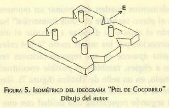 Partiendo de esta idea podemos ver las representaciones de este ideograma en los mosaicos subterráneos de serpentina de La Venta (figura 6, dibujos c, d, y e) como símbolos de este "lugar de creación"; también de La Venta son las hachas votivas con este signo en la parte central, de donde emerge una planta (figura 6, dibujos g y h), lo cual refuerza la idea de que se trata de un elemento terrestre. Si bien Marcus hace la lectura de "tierra" para un símbolo muy similar en San José Mogote (figura 6, dibujo h), me parece más adecuado definir este ideograma como un elemento terrestre, debido a que hay que agregar a la posible identificación del signo como piel de cocodrilo (metáfora del plano terrestre), un elemento de acción. Es decir, este lugar, la piel del cocodrilo, no es cualquier "tierra", es el lugar de la creación. Aunque he optado por el término "cocodrilo" como complemento que determina la expresión "Piel de...", podría ser que en la fórmula original el sustantivo se refiera a ese ser fantástico al que ya he aludido, y que no es otro más que el monstruo terrestre, mezcla de diversos animales.15 Sobre su lomo están situadas las esquinas del mundo y en el centro, una barra o poste que por el hecho de ser erigido se constituye en un acto de creación. El momento de erigir el poste o axis mundi lo vemos representado en esculturas olmecas como la del Príncipe, de San Martín Pajapan; joven sacerdote olmeca con atributos del ser felino en posición de levantar una barra. En consecuencia, la representación isométrica del ideograma "Piel de Cocodrilo" se aprecia como un plano terrestre sobre el cual están señaladas las esquinas del mundo, con un poste central en espera de ser levantado (figura 5).