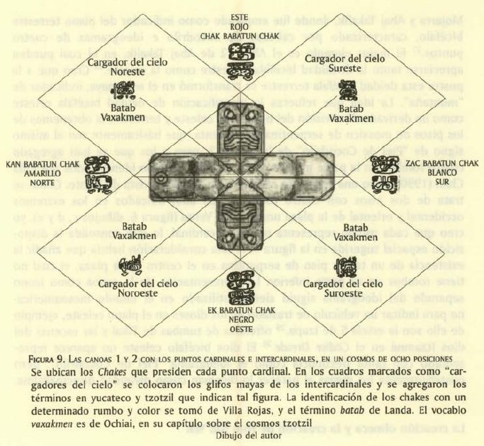 Lo anterior nos da pistas sobre la concepción del espacio que tenían los olmecas, pues si representan planos del espacio como el cielo y la tierra, muy probablemente indiquen algo sobre su orientación. Aceptando la idea de que la divinidad bicéfala celeste es una representación de la Vía Láctea en posición este-oeste, es de suponer que la canoa de Cerro de las Mesas tiene esa misma orientación. Ahora bien, la canoa de Isla Piedra con el ideograma de "Piel de Cocodrilo" en su centro tiene una hendidura en "v", que seguramente señala el este.20 Al sobreponer ambas canoas, colocando las hendiduras de los ideogramas hacia el este, y asumiendo que la Canoa 1 y las hendiduras de la deidad bicéfala se orientan a ese rumbo, resulta que la Canoa 2 orienta sus extremos en sentido norte-sur, de tal manera que las canoas integran una cruz (figura 8). Sobreponiendo ambos planos y orientándolos en planos cuadrados, obtuve un diseño en el que incluí los puntos cardinales e intercardinales, tal como los identificaron los mayas,21 con sus glifos respectivos; además de los nombres de los chakes que presiden cada cardinal, y ubiqué a los batabes como cargadores en los cuadros intermedios. Considerando la orientación al este del signo "Piel de Cocodrilo" en la Canoa 2, asumí que el eje de la canoa es norte-sur, lo cual indica que la canoa va en dirección norte, exactamente a la región donde se hizo la casa de las ocho divisiones al terminarse la creación del mito maya (figura 9). Esta disposición recuerda las concepciones del mundo que tienen los mayas de Quintana Roo y Yucatán, según Villa Rojas,22 así como la de los tzotziles de Chiapas, según los reportes de Ochiai.23 El diseño de esta concepción recuerda en general la disposición de las láminas 75 y 76 del Códice Madrid, así como el signo de rueda dentada del monumento 46 de San Lorenzo Tenochtitlán.24