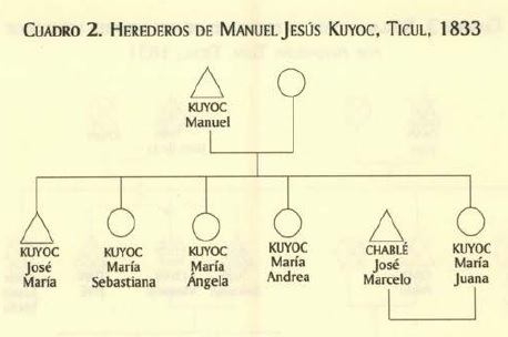 La actuación de cónyuges que defendían a nombre de sus hijos derechos de propiedad, confirma que el género no era un criterio restrictivo en la transmisión lineal de la propiedad, y la matrilinealidad se entreveraba con pautas patrilineales de resguardo patrimonial. Un caso que lo retrata claramente es el de los dos solares que heredó una mujer llamada Alejandra Tuin: uno, por parte de su abuelo materno y que debía compartir con sus hermanos, sus dos primas cruzadas y con los hijos de una de ellas; el otro, por su abuelo paterno y que en juicio verbal le fue reclamado por su tío, hermano de su padre, y por sus tres hermanos (cfr. cuadro 3).18