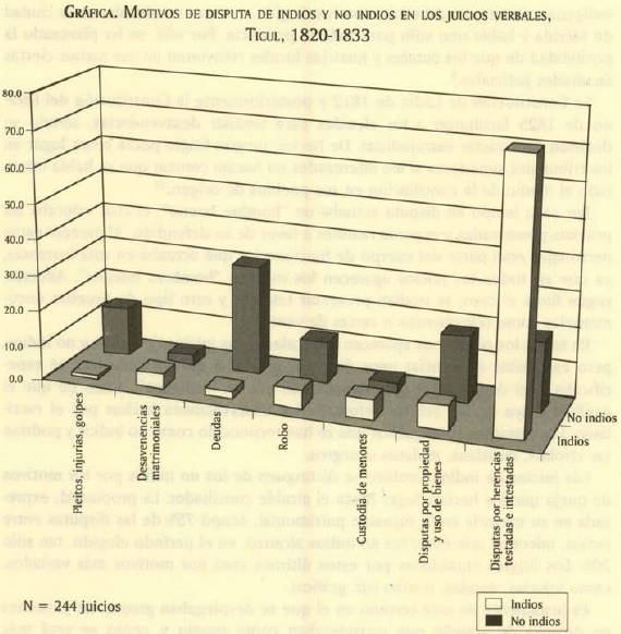 Los juicios de indios también se distinguen de los no indios por los motivos de queja que los hacían llegar hasta el alcalde conciliador. La propiedad, expresada en su mayoría en la sucesión patrimonial, ocupó 75% de las disputas entre indios, mientras que entre los no indios alcanzó, en el período elegido, tan sólo 20%. Los litigios entablados por estos últimos eran por motivos más variados, como injurias, deudas, o robo (cfr. gráfica).