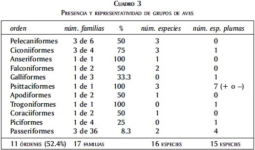 Sin duda esta diversidad biológica se puede apreciar a lo largo y ancho de los 141 523 km2 con que cuenta la península de Yucatán, en donde todavía prosperan 20 tipos diferentes de vegetación (Flores-Villela y Gerez, 1988). Por tanto, para cumplir con el propósito de determinar sí la presencia de aves es significativa o no, será suficiente una breve revisión referenciada de algunos de los órdenes reconocidos con el correspondiente número de familias incluidas y las especies detectadas como individuos, así como a través de las plumas, lo que en conjunto constituye una prueba concluyente de la diversidad y riqueza de especies utilizadas en la pintura mural (cuadro 3).