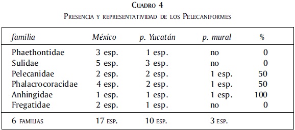 El sentido exacto de la riqueza específica y representatividad también se puede apreciar a través de un solo grupo, como el de los Pelecaniformes (cuadro 4). Éste está formado por seis familias con 10 especies en la península; sin embargo, sólo tres de estas familias figuran en la pintura mural, con tres especies en total (17.65%), el Pelícano café, el Cormorán oliváceo y la Anhinga americana. Entre estas familias, la Anhingidae incluye una sola especie (Anhinga anhinga), situación que hace que alcance 100% de representatividad.