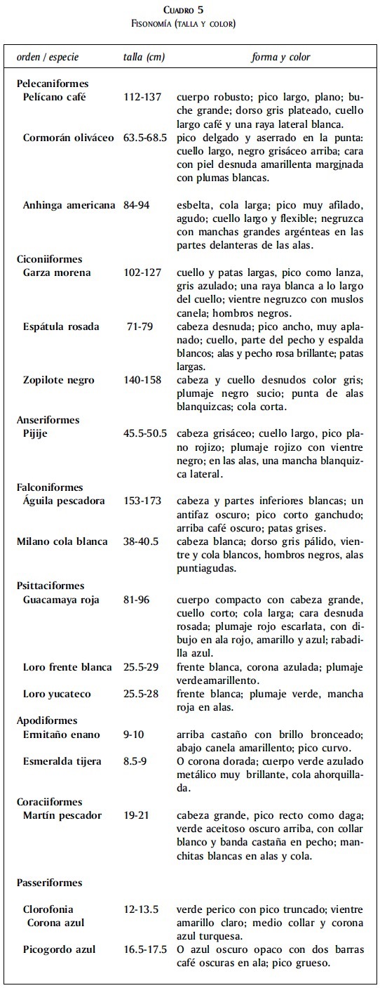 Con relación a ciertas características físicas distintivas se observó que 12 de las 16 especies (75%) presentan en alguna zona del cuerpo plumaje blanco (cuadro 5) en la frente o en el rostro plumas marginadas de blanco (como los loros y el cormorán); en el cuello una raya o lista lateral blanca (pelícano y garza); manchas blanquizcas en las alas o en la cola (anhinga, zopilote, pijije, martín pescador); el blanco se presenta en la cabeza, en pecho, vientre o en el dorso (la espátula rosada, águila pescadora y el milano).