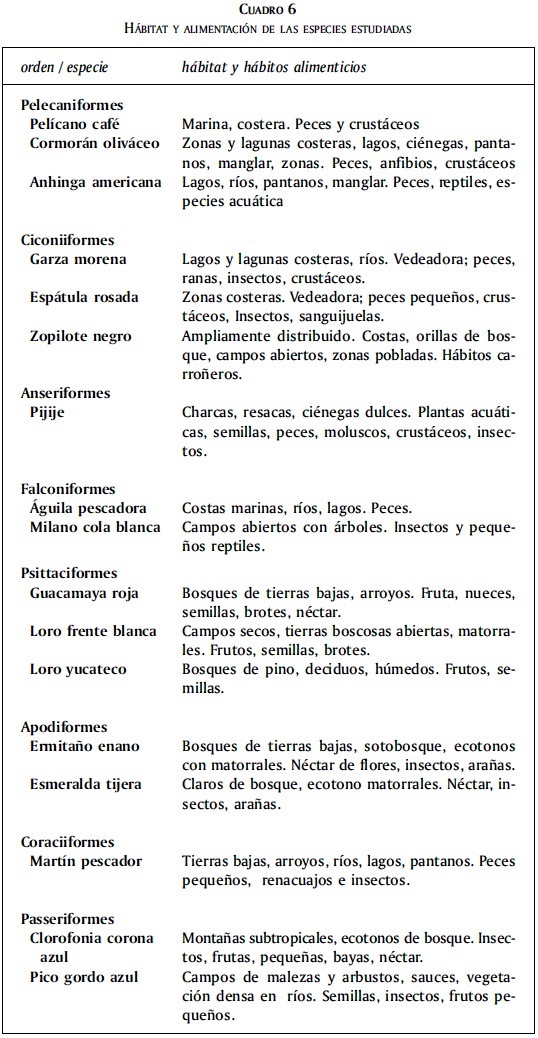 A estos rasgos distintivos se debe sumar el tipo de hábitat que frecuentan estas especies, así como su dieta básica. A este respecto se tiene que nueve de las 16 especies (56.25%) están relacionadas con cuerpos de agua, esto es, más de la mitad son aves marinas o costeras, viven en lagos, ciénegas, pantanos, manglares, ríos, arroyos o en simples charcas, motivo por el cual consumen de manera preferente diferentes tipos de peces, crustáceos, anfibios, reptiles e insectos. En oposición, las otras siete especies son propias de lugares boscosos o de matorrales en donde pueden encontrar insectos, arañas, frutos, bayas, semillas y néctar (cuadro 6), es decir, se distinguen dos clases principales de hábitat.