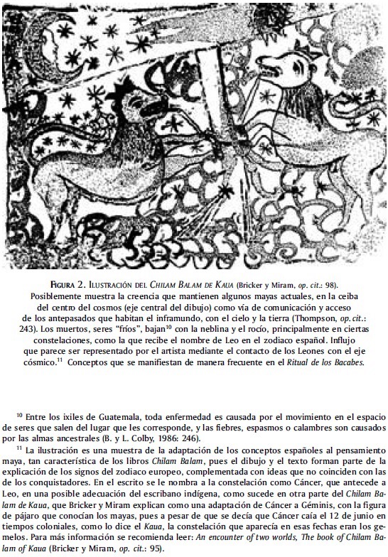 En el análisis de todos los textos coloniales consultados se observa que hay una constante y permanente lucha entre los hombres por mantener su "calor", y los que carecen de cuerpo y vagan por el cosmos, seres "fríos", como los muertos o los aires (ik) personificados, que tratan de arrebatárselo. Por ejemplo, en el Chilam Balam de Maní (Pérez, 1949: 59-61) y en el Kaua, se señala que en el cielo habitan fuerzas malignas que en algunas ocasiones, como la entrada de la constelación de Leo, bajan y se esparcen en la tierra. Pueden llegar a través de la neblina, el rocío, y traen consigo padecimientos a las personas, les ocasionan "frío" (figura 2):