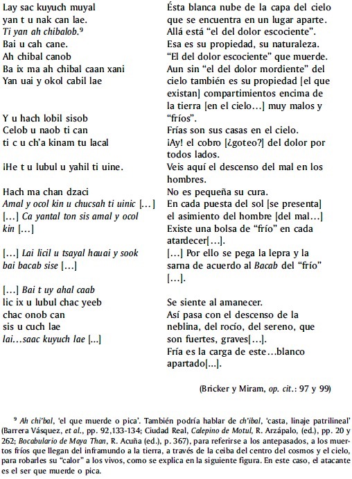 En los documentos mayas de los siglos XVI al XVII, el exceso de "calor"6 adquirido de manera brusca se manifiesta a través de chacau, 'calentura' y kaak, 'fuego', incluido en varias enfermedades graves de la piel, como uech kaak, 'sarna o granos de fuego con mucha comezón' y chuchum kaak, 'pezón de fuego o incordios', similares a tumores grandes con pus. Los males "fríos" incluyen en sus nombres los términos ziz, 'frío o fresco'; ziizkab, 'parálisis, adormecimiento e hinchazón' y zizthanen, 'fuerza o poder fríos'. También zac, que significa 'blanco e imperfecto', parece asociado al "frío" en ciertos padecimientos, como zackuxnak, 'panza blanca que duele', descrita como diarrea fría; ppoc zacan, 'sombrero o caperuza o sombrero blanco'; la hinchazón con dolor y el "frío" en las rodillas por caminar mucho, como una especie de gota; desmayos [zac cimil, 'muerte blanca o imperfecta'] y males de los ojos como zac, 'catarata', al parecer, por su clara asociación con la formación blanquecina del ojo. Inclusive hay ciertas partes del cuerpo relacionadas con el "frío", como ceel ich, 'lo frío del ojo', 'lo blanco', reconocido también como zacmapil ich (Ciudad Real, op. cit.: 115, 151-152, 154-155, 169, 170, 224, 250, 402, 667 y 756). Es de notar que al analizar la información anterior pareciera que en algunos casos, como la parálisis, el adormecimiento y la hinchazón, se refirieran a secciones del cuerpo en donde el "calor" solar del individuo no fluyera de manera normal o se detuviera.