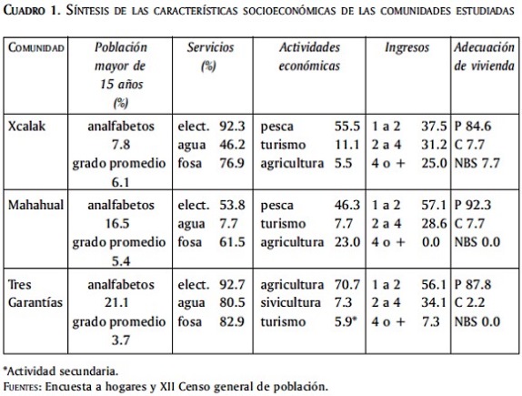 En el cuadro 1 se presenta una síntesis de las características socioeconómicas de las comunidades estudiadas. Esta información se refiere al porcentaje de hogares que disponen de servicios como la energía eléctrica, el agua y fosas sépticas; a las principales actividades económicas a que se dedican los miembros de las familias, y al ingreso familiar. Con los datos obtenidos sobre las características de la vivienda (número de cuartos; materiales de construcción de pisos, paredes y techos; cuarto para cocina) se calculó un índice de adecuación de la vivienda en donde se llega a una clasificación de los hogares en pobres (P), carecientes (C) y los que cubren sus necesidades básicas (NBS). Hay que señalar que este índice sólo muestra la adecuación de las viviendas; no pretende hacer una evaluación más completa sobre la calidad de vida. Se presenta también el nivel educativo de la población mayor de 15 años, de acuerdo con la información censal del año 2000, señalando sólo el porcentaje de analfabetos y el grado promedio de escolaridad.