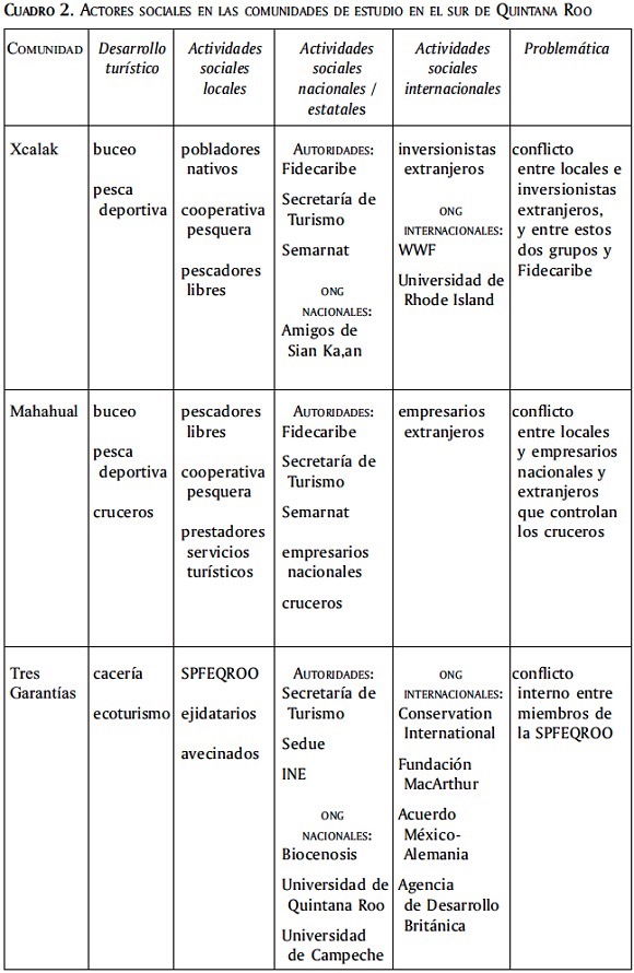 Podemos observar en la información sintetizada en el cuadro 2 que las interrelaciones entre los diversos actores sociales que participan en el proceso de desarrollo regional, en particular en el Proyecto Costa Maya, son conflictivas debido a los intereses de cada uno de ellos en relación con el turismo y los recursos naturales. La tierra, el agua, la fauna marina, los arrecifes coralinos constituyen los recursos naturales más importantes a nivel económico tanto para los habitantes locales (pescadores, prestadores de servicios turísticos), las autoridades estatales y nacionales, así como para los inversionistas privados mexicanos y extranjeros que han participado en el desarrollo turístico.