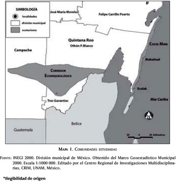Se seleccionaron para este estudio dos comunidades en la Costa Maya que son Xcalak y Mahahual, y una en el Corredor Ecoarqueológico, Tres Garantías, ubicadas todas ellas en el municipio de Othón P. Blanco.