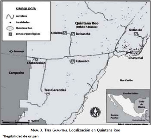En el caso de Tres Garantías, los principales actores sociales vinculados al turismo son los ejidatarios miembros de la Sociedad de Productores Forestales Ejidales de Quintana Roo. Son los ejidatarios quienes ejercen el poder político en la comunidad y controlan los recursos naturales. Los avecinados se sienten en desventaja pues no tienen acceso a los recursos forestales, aunque cuentan con tierra para la agricultura.