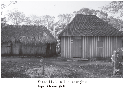 Type 1 structures are single-room apsidal or rectangular buildings composed of local materials palm thatch roof, walls of wooden boards, and a packed earth or sascab floor (figures 10 and 11). This is the housing technology used by village founders, and type 1 houses include examples that are among the oldest houses in the community. They often are occupied by the senior generation in a late stage of the family cycle and by households whose income is agriculturally based. These individuals are successful agriculturalists whose married sons and daughters and grandchildren live nearby in the community, often in houses made of non-local materials. Nevertheless, this housing technology has not been completely replaced; the average construction date for type 1 houses is 1990. New examples are still being constructed and used for residences, while others are maintained and repaired.
