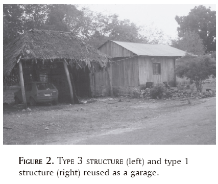 Type 3 structures are a single or double-room rectangular buildings, composed of laminate roofing, milled lumber walls, often painted, and a cement floor (see figure 2 left, figure 5, and figure11 left). These houses constitute a revival of an older technology using milled lumber, now combined with non-local laminate roofing. The technology had its origins in the lumber industry when previously the sawmill in Centenario was located within walking distance. The construction of a nearby sawmill in 1997 made wood boards and scrap lumber widely available again. The houses are carefully constructed, often using wood strips (chambranas) to cover the spaces joining the wall boards; many have exterior paint and elaborate carpentry doors and windows. The user group of type 3 structures is diverse, as these houses are constructed for both the younger and older generations as part of the family cycle. Nevertheless, a majority of the occupants of type 3 structures derived a part of their household income from wages, often from seasonal work in the lumber industry.