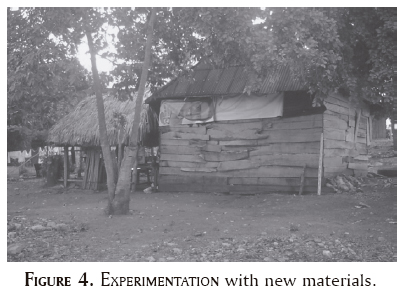 2 ) Experimentation. Subsequently, people try out the new technology to see how it performs in different circumstances. New building materials, especially laminate roofing, cement block, or cement flooring, are incorporated into existing structures by trial and error. Figure 4 shows an example of experimentation in the materials used for wall construction.