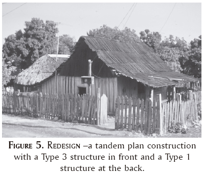 3 ) Redesign. In light of experimental results, a technology is modified or redesigned so that it performs better in different circumstances. Redesign also produces distinct functional variants. For example, the tandem plan arrangement of two buildings, one used as a living room and the other as a kitchen, is one of the principal functional variants in Silvituc (figure 5). Laminate roofing is waterproof, but it retains heat and makes occupation of the structure uncomfortable, especially at midday. Thatch is much cooler, and although this material presents greater risk of fire, it remains the roofing material of choice for kitchens. Cement flooring and cement block walls are prized for coolness, durability, and ease of cleaning, but they are costly. These materials are used for front rooms, whereas kitchens typically have packed earth or sascab floors and milled or scrap-lumber walls, materials that are easily replaced. In some cases, kitchens are redesigned as carports (see figure 2). Consequently, these building technologies have been redesigned to accommodate activities that occur in different parts of the residence.