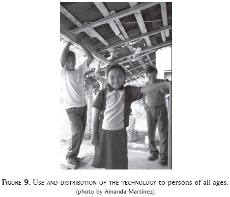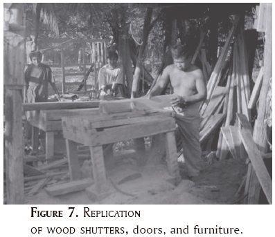 4 ) Replication. Specific functional variants of the technology are reproduced and distributed to user groups. Artisans may invent and construct copies of the technology and make it available to other inhabitants. For example, a single family of carpenters replicates wood doors, window shutters, and furniture used by friends, family and neighbors within the community. Alternatively, individuals who have specialized knowledge or who own the necessary tools may share their labor with others and thus distribute the technology within the community. This is the predominant replication process for installing metal laminate roofing (figures 6 and 7). Others may specialize in the construction of a specific kind of structure and commercialize its distribution. For example, the work of a mason known as "El quince de Zináparo", who builds cement block houses, is well known among communities in the region.