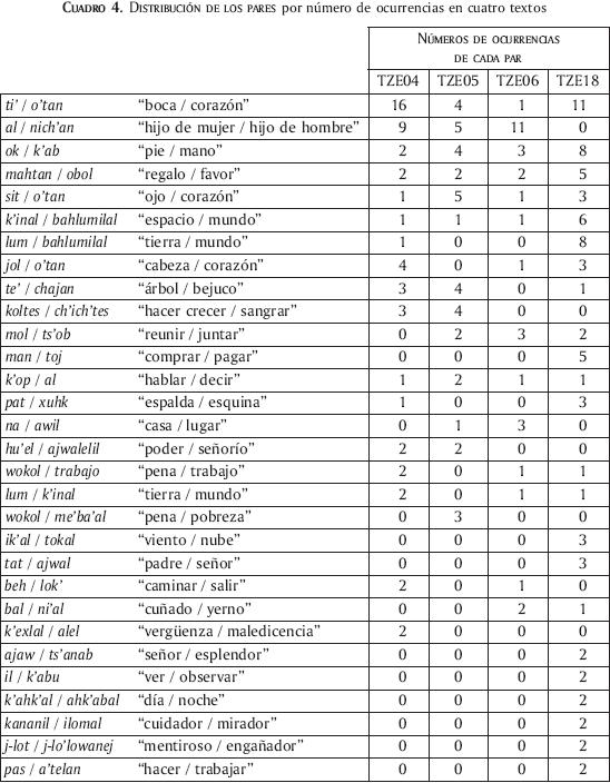 El cuadro 4 presenta los pares más frecuentes (con número de ocurrencias superior a dos) en transcripciones de performances orales donde el fenómeno del paralelismo está muy presente. Si una gran parte de los pares están presentes en cada una de estos performances, podemos notar igualmente que un par como al/nich'an "hijo de mujer/hijo de hombre" tiene un estatuto muy importante en términos de ocurrencias en los textos Tze04, Tze05 y Tze06, que corresponden a las tres pedidas de novia sucesivas y está ausente del texto Tze18 (bendición de la milpa). En este último texto, pares relativos al territorio como lum/bahlumilal "suelo/tierra", k'inal/bahlumilal "espacio/tierra", pat/xuhk "espalda/esquina" o ik'al/tokal "viento/nube" tienen un estatuto predominante. En lo que concierne el "montaje" de los tres textos de pedidas de novia, el primero insiste en la complementariedad te'/chajan evocando el árbol y la liana, así como las figuras del hombre y de la mujer mientras que el segundo tiene que ver sobre todo con la unión que resulta del matrimonio de tales entidades complementarias y el tercero con la fundación de un hogar y la identidad de los lugares que derivan de ésta.