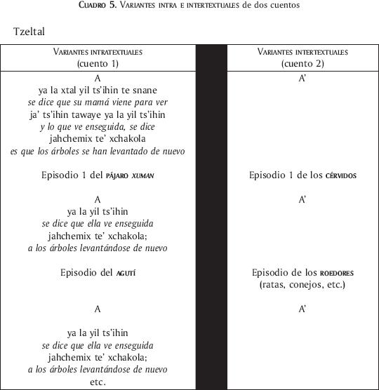 En un cuento, otras finalidades pueden estar presentes. La estructura, menos compleja "the couplet structure of myth is looser and less consistent" dice Victoria Bricker (1974: 375) permite adivinar otro tipo de objetivo narrativo, muy alejado por cierto del cuento moralizador occidental. Si observamos un ejemplo tzeltal, el cuento de la milpa del sol, constatamos que entre los pasajes demarcativos que dan ritmo al relato (A); se inscriben episodios (1, 2...) variantes estructurales del texto pero que estas variantes cambian entre ellas mismas según criterios enunciados más arriba: las preocupaciones de cada narrador con respecto a una plaga agrícola sufrida por la comunidad, le incitarán a introducir en esta perspectiva los elementos variables dentro de la estructura que toman entonces figura de variaciones. Al pájaro (episodio 1, cuento 1) se sustituirán los cérvidos (episodio 1, cuento 2). A los agutíes que siguen al pájaro en la versión anterior, los remplazarán los roedores. La finalidad de este cuento puede ser asimilada a una crónica, género todavía mal definido pero que parece de gran importancia en la tradición maya contemporánea, como lo es en otras tradiciones indígenas.