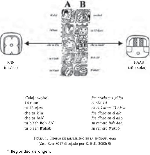 Tenemos numerosos indicios del uso del paralelismo desde los textos epigráficos hasta la literatura contemporánea (Lounsbury, 1980; Lacadena, en prensa; Hull, 2002; Bricker, s.f.). He aquí un ejemplo interesante, ya que se trata de un leitmotiv muy presente en la tradición oral que involucra conceptos relativos al tiempo.7