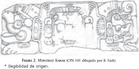 El monstruo Kawak de dos cabezas es un icono que expresa los dos aspectos contrastados de la tierra. A la izquierda, la cabeza de un sapo, símbolo de la tierra húmeda y fértil; a la derecha, una máscara esquelética, símbolo de la tierra árida (según Baudez).