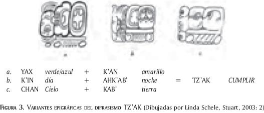 Estos tres bloques de glifos ilustran tres maneras diferentes de escribir la palabra uts'akah "cumple/cumplió". Aquí, la raíz TZ'AK "cumplir" puede ser representada por la asociación azul-verde/amarillo (a), día/noche (b) y cielo/tierra (c). Los dos últimos casos elaboran el concepto de completud extirpado de la asociación de los dos términos, mientras que el caso (a) es una figura más compleja de entender.