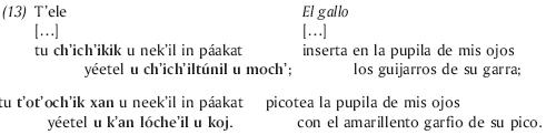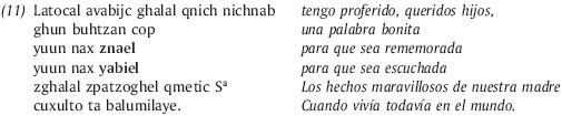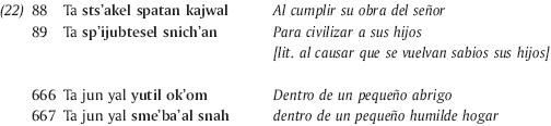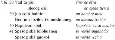 Tenemos otro buen ejemplo de conocimiento de los mecanismos creativos de paralelos en los versos citados por Bricker en los cuales un padre bilingüe (castellano y tzotzil) traduce y reescribe en paralelos una proclama del rey de España a los indios de Chiapas para que desconfíen de Napoleón: