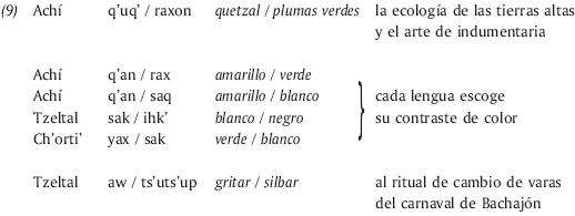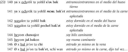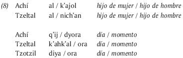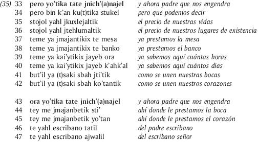 El paralelismo se manifiesta como procedimiento discursivo denso en los géneros rituales, pero también en las situaciones más cotidianas de interacción (de lo doméstico a lo intercomunitario) y en todas las ocasiones de ritualización, de emoción,8 de interacción con los ancestros, autoridades o entidades sobrenaturales así como, de una manera más moderada, en el uso cotidiano (Haviland, 1992; Monod Becquelin, 2007).9 La extensión transgenérica de este fenómeno se ve ilustrada en varias situaciones: defensas tzotziles, cambios de cargo tzeltales, plegarias ch'orti'; en yucateco está presente en proverbios, rezos, profecías, narrativas históricas, adivinanzas (Bricker, 1974: 381); se encuentra también en "mitos" y cuentos. Más aún, el paralelismo surge también en el hablar cotidiano para precisar el concepto utilizado.