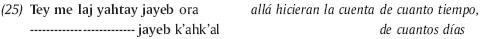 7 En la predicatoria de Chan Santa Cruz citado por Bricker se encuentra t u mèen k'uch t u 'oorahil t u há'abil "because it has arrived in the hour, in the year" (Bricker, 1974: 385); en tzotzil, los pares unen los días con los meses ta lajcheb 'ue, ta lajcheb k'ak'ale "en doce meses, en doce días", las fiestas con los rituales ta smuk'ta k'in, ta smuk'ta paskwa "en las fiestas en el ritual", el momento en el sentido de los tiempos con los días jtabetik 'o me li yorail, jtabetik 'o me li k'ak'alil "hemos logrado el tiempo justo, hemos logrado los días adecuados"; en tzeltal se encuentra también los pares ora / habil, ora / k'ahk'al y muchos otros. Ora, en estos contextos, no significa 'hora", sino más bien "tiempo adecuado", "tiempo previsto"; en este sentido, está frecuentemente asociado con sbahbial "del origen, primero", y k'in con yu'tsilal bahlumilal, "el bienestar del mundo".