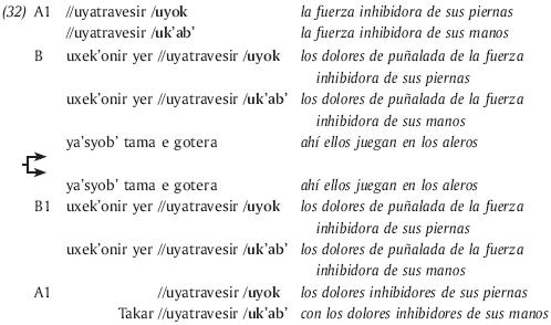 Sin embargo, el paralelismo está limitado al uso de términos pareados en la imitación de los géneros rituales, sin contribuir en la organización del texto a niveles más amplios (Monod Becquelin, 1995: 89-90).