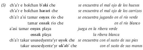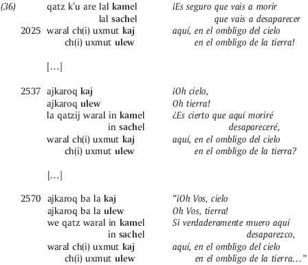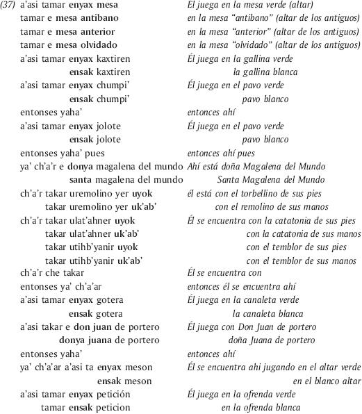En el ejemplo siguiente (37), esta búsqueda del lugar de "contaminación" por un espíritu malo empieza a través de elementos asociados a los lugares de ofrenda a la tierra (aquí personificada por Santa/ doña Magalena del Mundo). En un segundo tiempo, en la parte que contiene el par ok/k'ab' "pie/mano", se señala la localización en el momento del ritual de esta enfermedad, es decir en el cuerpo del enfermo. Por último, la búsqueda sigue con elementos asociados a la casa y a los lugares de ofrendas domésticas. Esto va en el sentido de Rumsey (2001) que ve en la utilización del paralelismo una capacidad de unir mimesis y diégesis o como lo dice él: "el mundo del enunciador y el de la narración", lo que llama él "meta-narración".