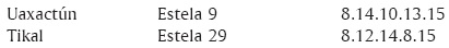 Contrapusimos líneas arriba los conceptos constantes de la inscripción del sarcófago (RC más glifo) con los del Tablero Este (ND más glifo). Conviene ahora contraponer las RC involucradas en ambos textos en su progreso a través del tiempo: