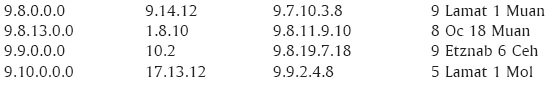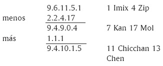 Con excepción de las fechas 9.13.10.1.5 y 9.13.10.0.0, todas las demás ya han sido interpretadas en términos de la escuela histórica. Como se verá, 9.13.10.1.5 se ajusta con perfecta lógica a las demás fechas y la redonda 9.13.10.0.0 sirve de punto de orientación en esta sarta de fechas.
