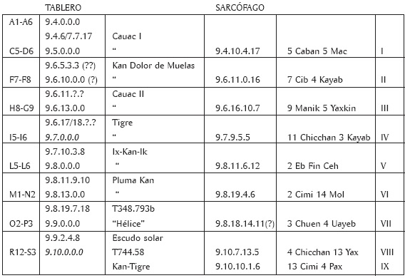 Quiere decir que a una fecha del Sarcófago suele seguir a poca distancia otra en el Tablero, exceptuando naturalmente las dos últimas, que rebasan el marco del Tablero con sus fechas no más allá de 9.10.0.0.0.
