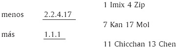 Por lo pronto aceptamos las nueve lecturas de Ruz, incluyendo su rectificación de leer una de las RC como 11 Chicchan 3 Kayab en vez de 4 Kayab como dice el texto, ya que un día Chicchan normalmente sólo puede caer en las posiciones 3, 8, 13 o 18, y con esta corrección se violenta lo menos posible la información maya.