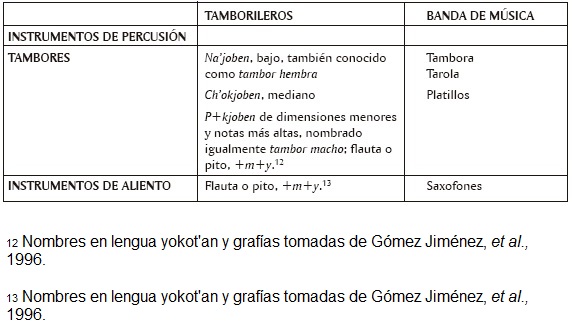 El sonar de flauta y tambores ejecutados por niños y jóvenes, en las versiones de Buenavista, es cambiada por una banda de adultos compuesta de tambora, tarola, platillos y saxofón, en Tamulté de las Sabanas. Estos conjuntos se colocan entre los espectadores, sin que su presencia reste espectacularidad a la danza; de tal forma que la música se funde con el entorno a manera de un sonido inherente al bailable ritual. Las notas de viento y golpe brotan produciendo frecuencias desde muy elevadas a profundas, haciendo vibrar el aire caliente y los tímpanos de los escuchas con la melodía, armonías y ritmo de piezas como El Tigre, en Buenavista, o géneros modernos interpretados en el caso de Tamulté.