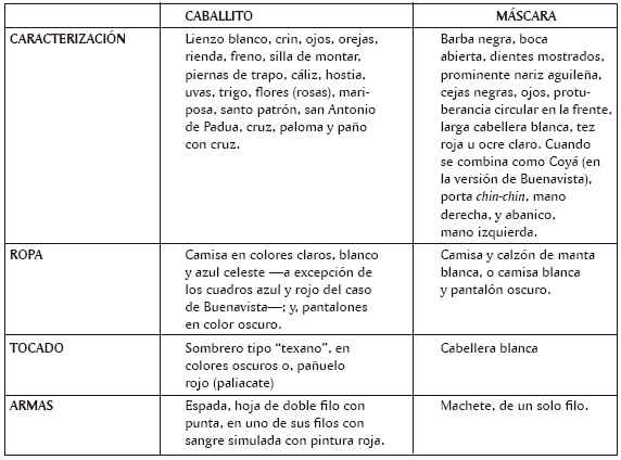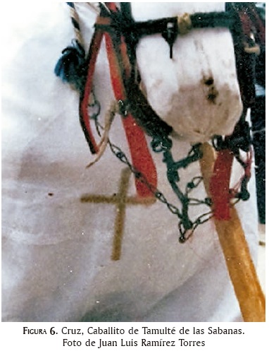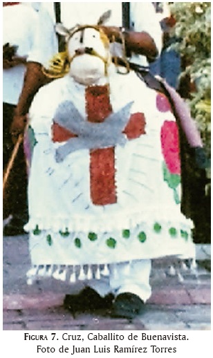 En contraste, la figura del caballito, asociada con el español, es estimada como una entidad casi reverencial, animada y vital. El trato de privilegio que se le concede cada año en la fiesta, "alimentándolo" con pastura, maíz y agua, da una idea de la importancia que se le asigna, no sólo al animal en sí, sino a lo que éste representa para los indígenas: caballito-español-victoria. Los símbolos que exhibe no dejan lugar a dudas: en el pecho lleva el emblema de la cruz, y sobre su lomo, al jinete con la espada ensangrentada, que remite a la herida del adversario (Rubio, 1996a: 247).