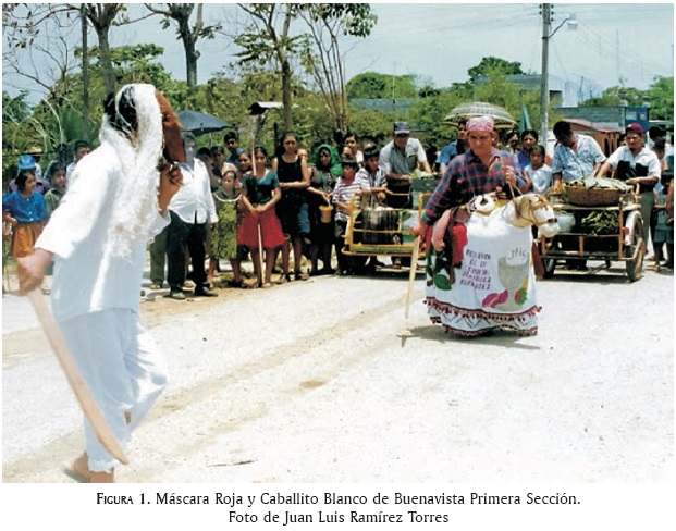 Este espectáculo contemporáneo de historia no es una referencia descriptiva de un hecho pasado, sino una interpretación, desde referencias al pasado, encaminadas hacia una comprensión del presente. Por tanto, la aparición del Caballito Blanco no ha de ser entendida obligadamente en una perspectiva unidireccional: Caballito = Conquistador español. Por el contrario, debe procederse con mayor cautela y partir del carácter metafórico del rito que nos lleva a la presunción de que el equino personaje es tanto significado como significante; esto a la manera del bricolage dado por Lévi-Strauss,16 cuyo carácter incidente se aplica a la composición heteróclita del mito, y cuya cualidad de éste transmite, evidentemente, al rito. Esto permite explicar el por qué la cultura chontal ha construido un discurso dancístico utilizando los materiales significantes de la conquista ibérica, respecto a lo cual son relevantes las consideraciones levistrossianas: