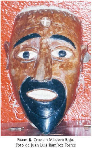 En tal perspectiva regresemos a la plástica de la danza y prestemos particular atención a la contextura iconográfica del Caballito Blanco. En las tres versiones conocidas (Tamulté de las Sabanas y las dos de Buenavista), se ostenta siempre una cruz (figuras 5, 6 y 7), emblema que se reitera en la protuberancia de la frente de Máscara Roja (figura 8);20 por igual, en el manto blanco de Caballito, suelen bordarse o pintarse representaciones de flor o mariposa (figura 9). Estas imágenes cruciformes y florales, amén de la mariposa, evocan diversas versiones precolombinas del jaguar. Las manchas características de este animal, o, en otras palabras, los rosetones negros que le distinguen (Ruíz Gallut, 2005: 30-31) gráficamente, se asocian con la silueta de la flor; así es que resulta particularmente relevante el jaguar florido de los murales de Teotihuacan (Séjourné, 2002: 274275) que empatan con lo señalado por María del Carmen Valverde: "todas las imágenes del carnívoro con motivos vegetales y acuáticos, como flores, lirios, jades, chorros de agua, etc., aludirían precisamente a este mismo complejo simbólico" (Valverde, 2004: 292).