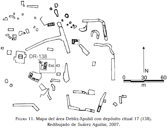 El área de donde provienen los depósitos que se incluyen en este estudio se ubica a 1.5 km al poniente del centro del sitio y fue llamada Debliz-Xpuhil. En dicho lugar se registraron 61 estructuras de diferentes dimensiones y formas. En las estructuras 35 y 43 se recuperaron vasijas que se registraron como depósitos rituales. Estas dos últimas estructuras están conformadas por un basamento y su construcción superior era de materiales perecederos, se consideraron como unidades habitacionales de familias extensas del estatus económico y social similar (Suárez y Ojeda, 2007: 101).