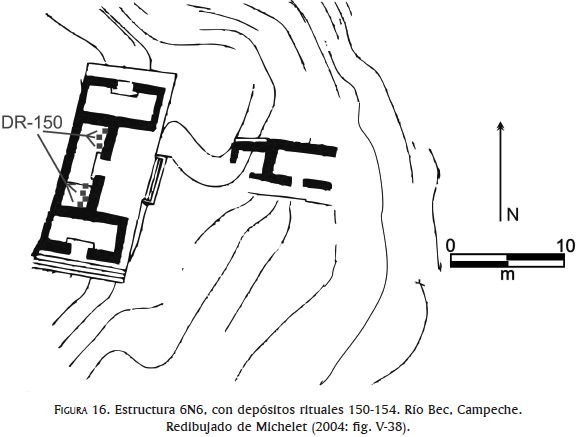 25 (DR-150).- Se localizó en la estructura 6N6 del grupo B a 10 cm abajo de la superficie actual del terreno. Está centrado al pie de la plataforma que antecede la escalinata del basamento. Al sur del depósito se hallaron vasijas estriadas, así como cajetes de color rojo y negro asociados a lascas. Al norte había un cuello de olla colocado boca abajo que cubría un hacha y una navajilla excéntrica de sílex. Al centro de ambos sectores se encontró una concha tallada (Michelet, 2004: 32-33).