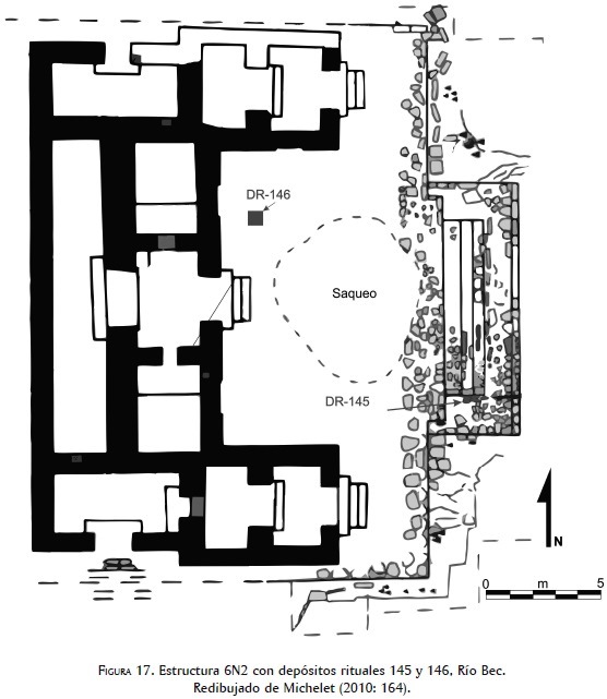 35 (DR-160).- Se localizó en la esquina de los cuartos e-f, justo donde se une con el cuarto m de la estructura 5N2. Debajo del piso de estuco intacto se localizó una concentración de 46 tiestos, entre los cuales había 14, de varias formas, que corresponden al grupo Sierra del Preclásico. Se considera que este depósito fue hecho intencionalmente durante el Clásico Tardío para arraigar la construcción a una tradición ocupacional (Michelet et al., 2010: 172).