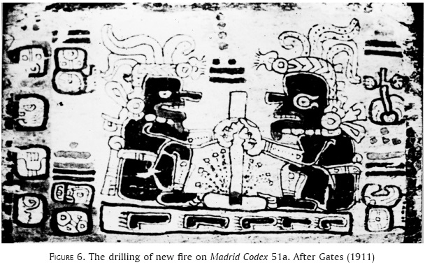 Several of the deities from Madrid 19b are also pictured drilling new fire in the almanacs on Madrid pages 38b, 38c, and 51a, including the black merchant deity (God M) and Itzamna. As we discuss below, this is one of the rituals associated with the annual renewal ceremonies of the contemporary Ch'orti' Maya.
