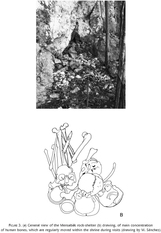 The osteological and taphonomic analyses at Mensabäk were carried out during 2010 and 2011 and encompassed several sacred contexts ranging from minor, isolated shelters with few skeletal and ceramic fragments, to large ritual deposits characterized by an abundance of Lacandon Maya "god-vessels" (shiicas) and human remains. Given such variability, we will focus this study on the Mensabäk and Sak Tat rock-shelters that are the most important sacred shrines around the lagoon and those that contain the great majority of human remains.