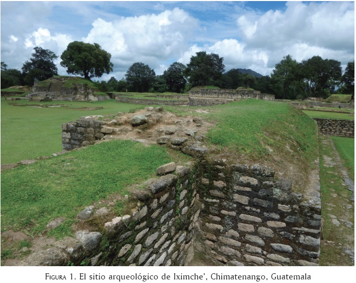 El sitio de Iximche' se encuentra en el área central del altiplano guatemalteco, en la región kaqchikel, aproximadamente a 90 km al este de la ciudad de Guatemala y cerca de tres km al sur de Tecpán (Kraemer, 2007: 69). Destaca por haber sido el centro político precolombino de los kaqchikeles durante más de 50 años, antes de que los españoles la conquistaran y destruyeran en 1524 (Guillemin, 1967: 23-25). Bajo la dirección de George F. Guillemin se excavó el sitio entre 1958 y 1972; tras su fallecimiento, otros investigadores, como Stephen Whittington y Roger y Vally Nance se encargaron del análisis de los datos (Kraemer, 2007: 77). Hoy en día es un lugar turístico con un pequeño museo (figura 1). Es necesario destacar que en Iximche' no se ha encontrado evidencia de texto jeroglífico precolombino alguno (Grube y Fahsen, 2002: 233), y todavía se sigue discutiendo, si los kaqchikeles usaron la escritura jeroglífica en las épocas precolombinas, porque tampoco se ha encontrado evidencia material de ello (Christenson, 2001: 17; Sturm, 1996: 119).