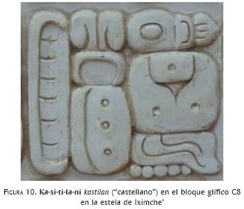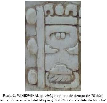 Los complementos fonéticos aparecen con varios logogramas calendáricos para indicar su pronunciación en kaqchikel. Por ejemplo, el silabograma modificado qa con el glifo T521 "periodo de 20 días" (WINIK/WINAL en el corpus precolombino) señalando su pronunciación winäq en el quinto número de distancia (figura 8; véase también el uso de un mismo complemento fonético con el mismo logograma como la palabra kaqchikel winäq, "pueblo" en la segunda mitad del bloque glífico D1, figura 9). En cambio T521 WINIK/WINAL suele aparecer con los silabogramas ki o la como complemento fonético en los textos antiguos (p. ej. T521-ki en la plataforma del Templo XIX en Palenque, lado sur, bloque A3, véase Stuart, 2005: 191, 210; T521-la en el marcador del juego de pelota de Caracol, bloque B4, véase Helmke et al., 2006: fig. 2). Pero las combinaciones de logogramas con complementos fonéticos son más frecuentes en la estela moderna en contextos no calendáricos, sobre todo si la pronunciación kaqchikel del logograma no corresponde a su pronunciación precolombina. Si bien aparecen unas combinaciones en la estela de Iximche' que figuran en las inscripciones antiguas, como T1000d AJAW con complemento fonético T130 wa para indicar kaqchikel ajaw, "señor", en el bloque glífico E1,15 la mayoría de las combinaciones de logogramas con complementos fonéticos en la estela de Iximche' reflejan la identidad kaqchikel del texto. Por ejemplo, T609 'libro' (HUN en el corpus precolombino) combina con el complemento fonético T88 ji para indicar que corresponde con kaqchikel wuj (bloque glífico H1). De la misma manera, T736v 'muerte' (KAM/CHAM en el corpus precolombino) aparece con T102 ki para señalar la pronunciación de la sílaba final en kaqchikel kamik. Tales combinaciones de glifos no aparecían en los textos antiguos; surgieron como reacción a la necesidad de adaptar la escritura al idioma kaqchikel. Los logogramas indican la adaptación de la escritura jeroglífica recuperada al contexto del idioma kaqchikel en las combinaciones innovadoras de logogramas y complementos fonéticos que no aparecen en los monumentos jeroglíficos antiguos. Además, afirman la posición del idioma kaqchikel como parte de la identidad kaqchikel dentro del pueblo maya.
