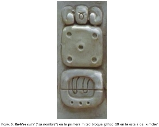 Como la estructura silábica prevaleciente de CVC (consonante-vocal-consonante) y el orden básico de constituyentes oracionales VOS (verbo-objeto-sujeto) en los idiomas mayas modernos corresponde a la que también se encuentra en la escritura jeroglífica (Campbell y Kaufman, 1985: 193; Sak Chuwen, 2011),13 la utilización de los glifos antiguos para escribir los idiomas modernos como el kaqchikel es, en principio, practicable. La mayor parte de las sílabas en el kaqchikel colonial y actual se encuentra también entre los glifos silábicos precolombinos (Johnson, 2013: fig. 1.14; Brown et al., 2006: tabla 1.2), pero para poder escribir precisamente en kaqchikel y otras lenguas modernas con los glifos antiguos, era necesario introducir nuevos glifos al corpus jeroglífico que representaran tonos que se usan actualmente, pero no se conocen en los textos precolombinos. Las consonantes fonémicas del kaqchikel colonial y actual que no se encuentran en el corpus jeroglífico precolombino son la oclusiva uvular sorda /q/, la oclusiva uvular glotalizada /q'/ y la vibrante múltiple alveolar /r/. Para escribir sílabas con estas consonantes como sonido inicial, se modificaron silabogramas precolombinos, agregándoles un signo diacrítico que asemeja la letra <m> de forma cursiva o, como en la estela de Iximche', la forma minúscula de la letra griega gamma <ɣ>, dependiendo del escriba (Schele y Grube, 1996: 133; Sturm, 1996: 119-120; Sak Chuwen, 2011). Para crear las sílabas con /r/ inicial, se integró el diacrítico en silabogramas precolombinos con /y/ inicial; para las sílabas con /q/ y /q'/ iniciales, se usa como base los silabogramas con las consonantes iniciales /k/ y /k'/, respectivamente (Sak Chuwen, 2011). Por ejemplo, para escribir la primera sílaba de la frase "su nombre" en el texto de Iximche', se le agregó el diacrítico al silabograma antiguo T61/6214 yu en una frase con b'i-'i para indicar la pronunciación kaqchikel rub'i' (figura 6). Se supone que se escogieron estos signos como diacríticos porque no se asemejan a ningún signo en el corpus jeroglífico precolombino y de esta manera no se confunden con glifos antiguos.
