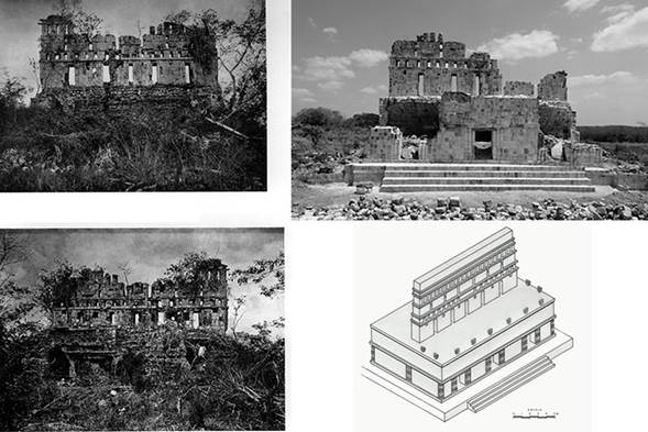 Figura 12 A la izquierda, arriba y abajo, los registros realizados por Maler (Según Maler, 1997); arriba a la derecha, el inmueble restaurado, y abajo a la derecha, su reconstrucción hipotética