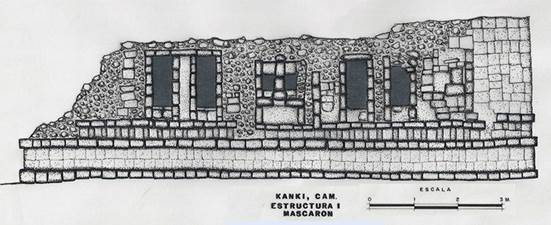 En otro sector septentrional de Campeche, a unos 50 km al norte de Edzná, encontramos un interesante ejemplo de crestería propia de la arquitectura Puuc temprana: el caso del Edificio 1 de Kankí, en el municipio de Tenabo. El centro de la representación es ocupado por un mascarón de prominente nariz. Sus ojos son dos vanos y la boca fue lograda en estuco, material que también formó diversos relieves en el costado oriental de la crestería. A cada lado del rostro fantástico hay otras dos caladuras, ahora dispuestas en sentido vertical y que brindan mayor luz a la composición (Figuras 14 y 15).