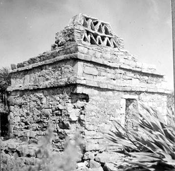 Poco más al norte, en Tancah, Lothrop (1924: 127) registró otra crestería pequeña pero vertical, y nuevamente al norte, en la Estructura I de Xelhá, reportó otro remate superior, ahora un murete calado, pero de forma triangular (Lothrop, 1924: 135, fig. 136) (Figura 21) que evoca aquellos remates del Palomar de Uxmal.