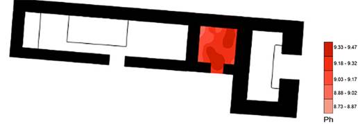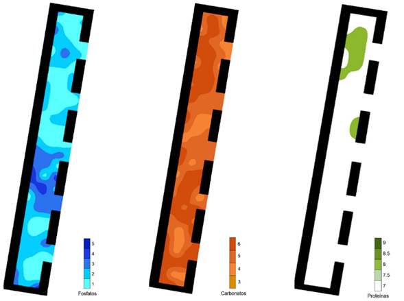 Los valores más altos de residuos proteicos se encuentran acumulados en forma de bandas en las orillas oriente y poniente del cuarto, dejando prácticamente un pasillo sin rastro de proteínas al centro de ellas (Figura 25). Las dimensiones del cuarto son demasiado pequeñas, de 2 x 2 m, por lo que podría tratarse de un lugar destinado al almacenamiento de bienes, en particular de alimentos de origen animal.